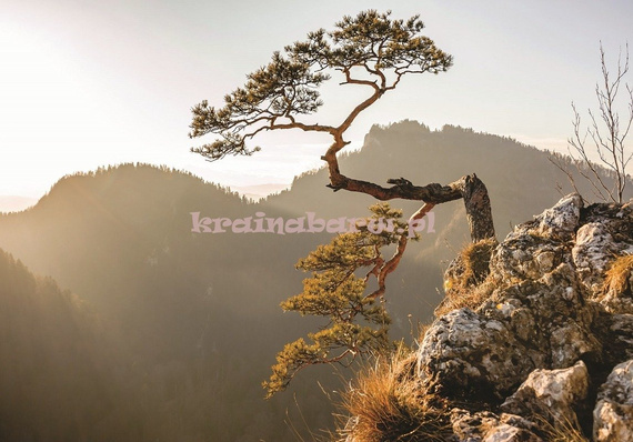 Samotna sosna rosnąca wśród skał,a za nią widok na góry.