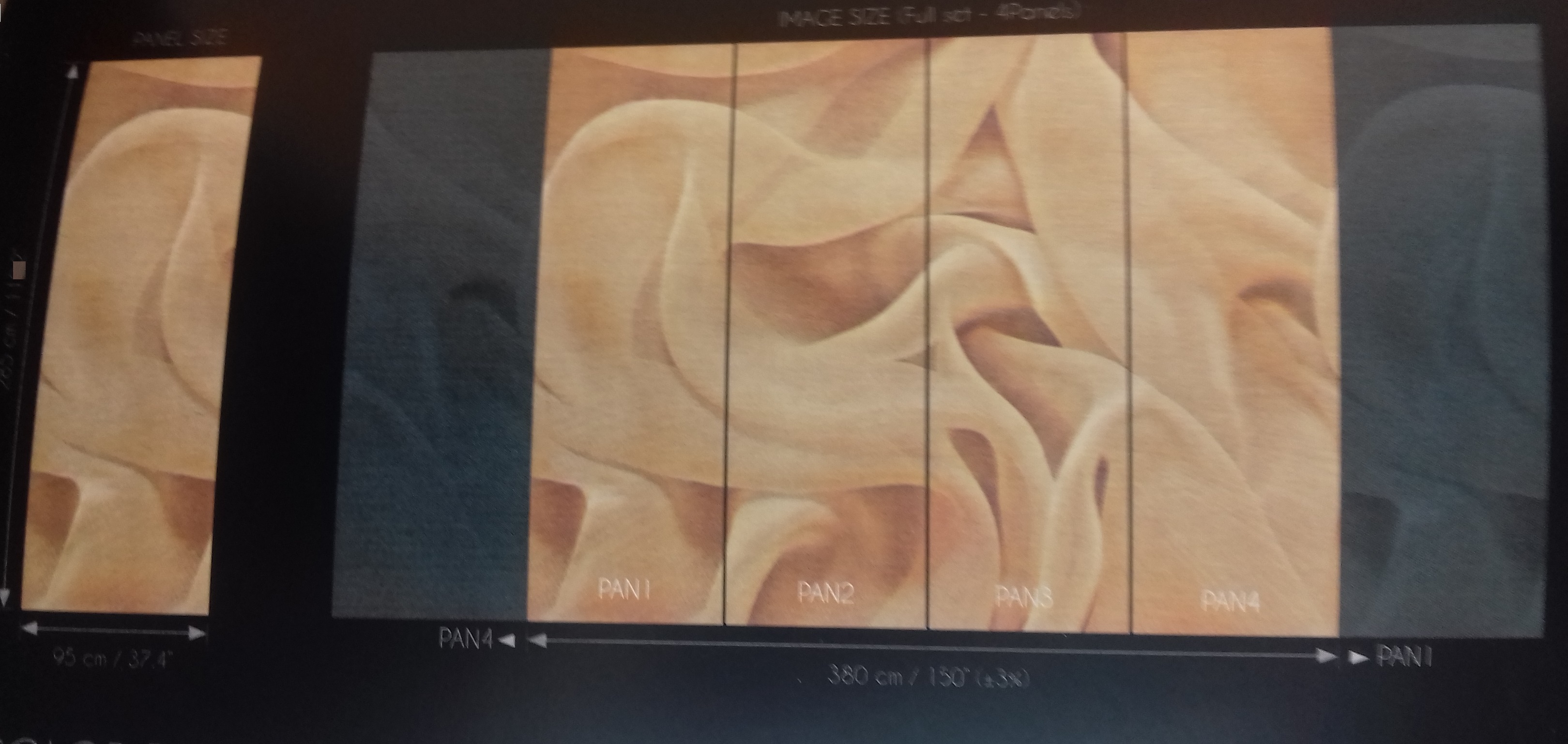 Aranżacja w rozmiarze :szerokość 380cm x wysokość 285cm, przedstawia zestaw 4 paneli .