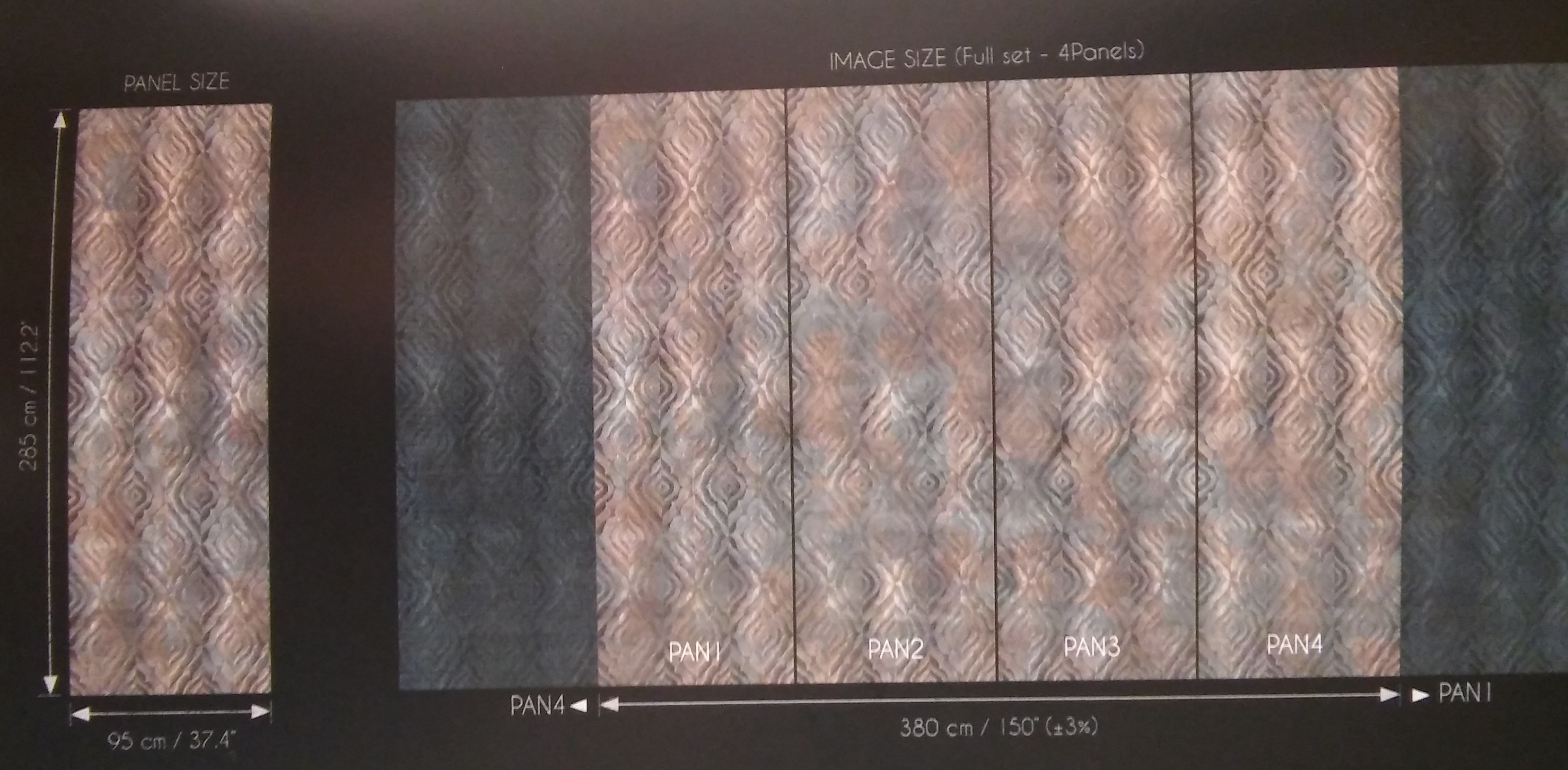 Aranżacja w rozmiarze :szerokość 380cm x wysokość 285cm, przedstawia zestaw 4 paneli .