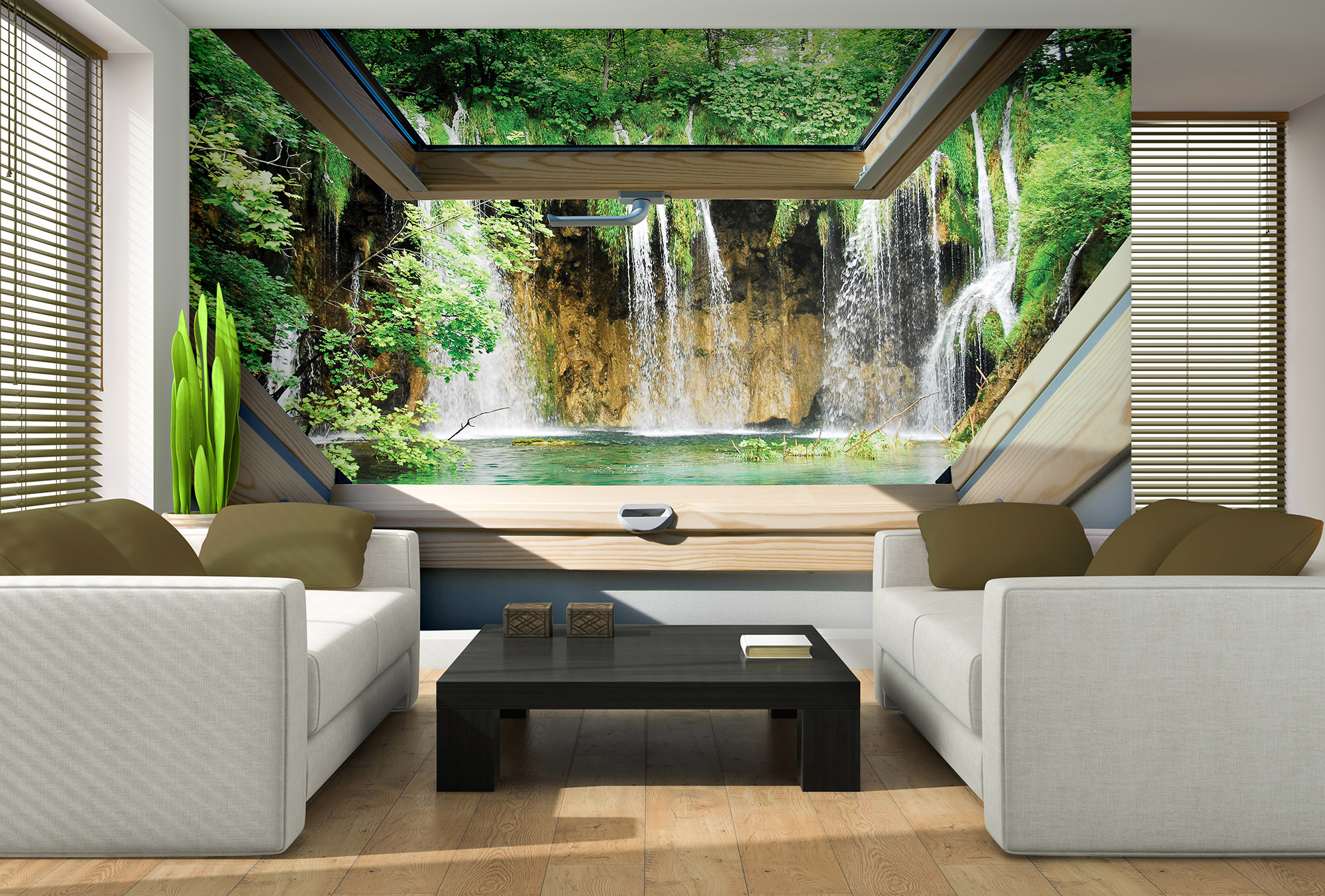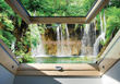 widok;perspektywa;okno;dach;krajobraz;natura;wodospad;las;drzewa;zielony;jezioro