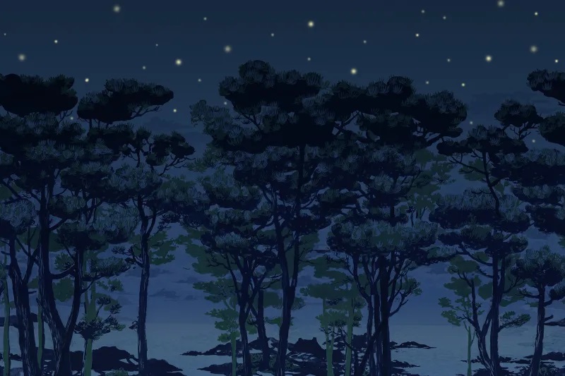 Gdy nad tym magicznym lasem zapada noc, za pniami drzew można dostrzec czające się magiczne istoty. Ten wzór będzie wspaniale wyglądał na wszystkich ścianach w twoim pokoju – umieszczając cię dokładnie w głębi lasu.