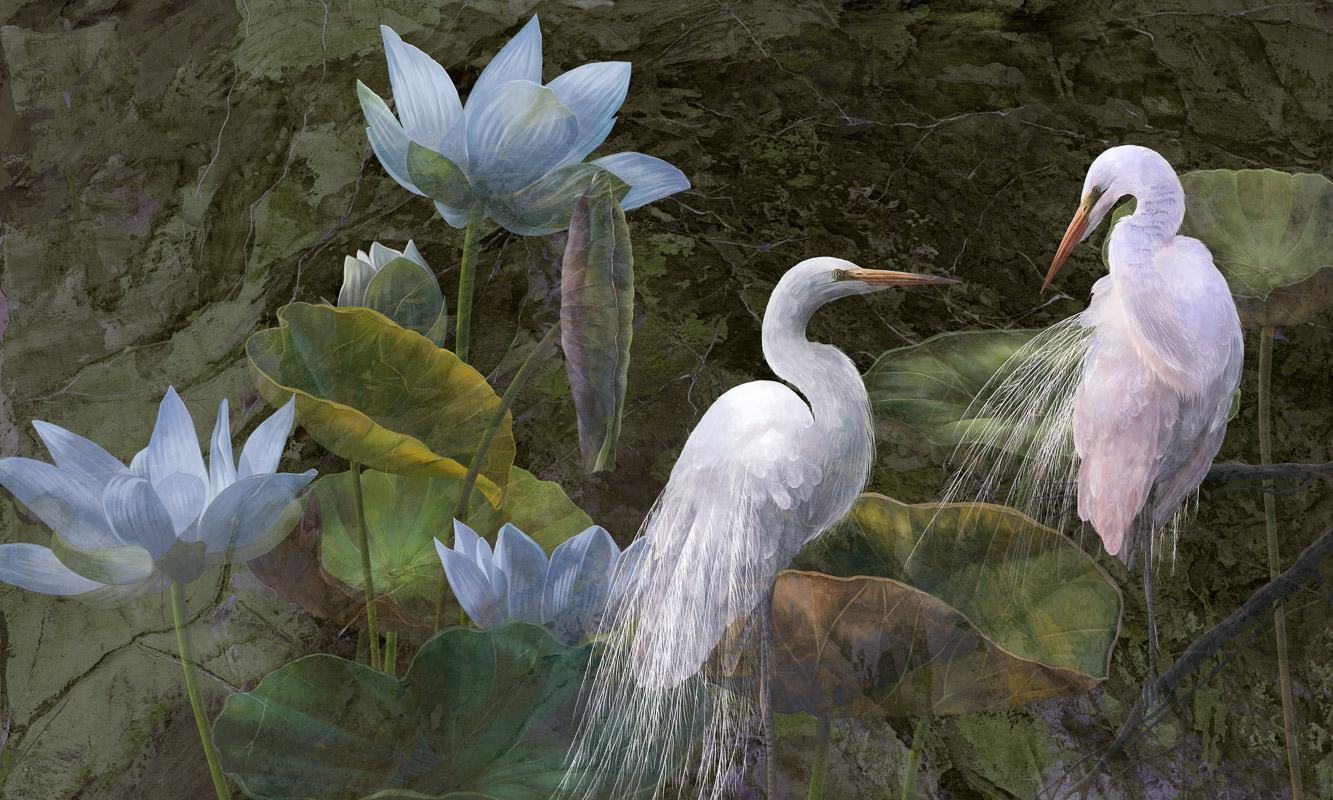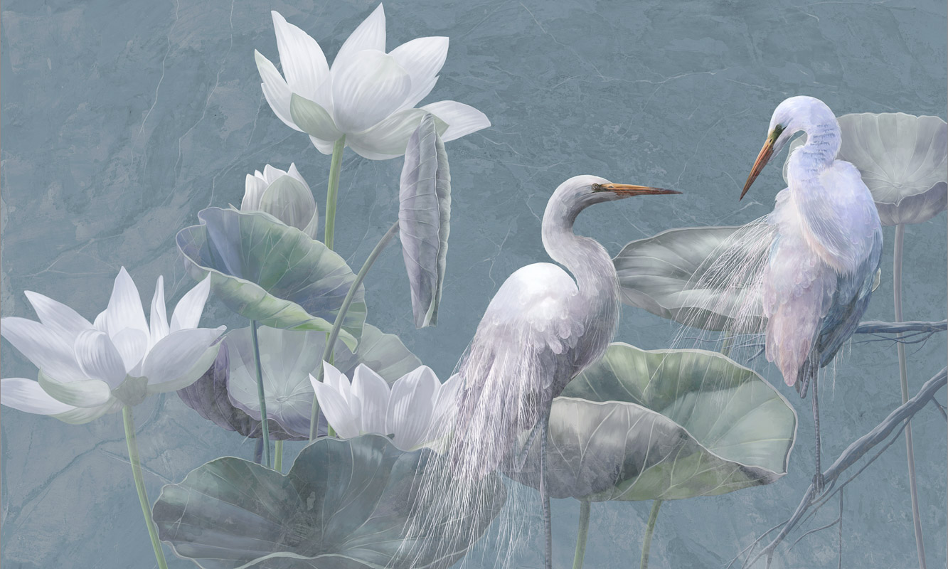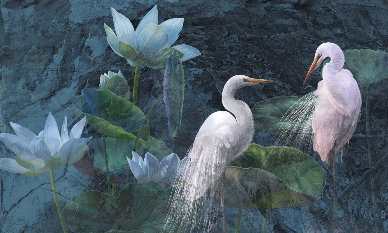 Fototapeta z nowoczesną grafiką, z wyczuwalną fakturą, w dotyku lekko chropowata. Dwa duże białe ptaki spacerujące wśród liści i kwiatów zachwycają swoim wyglądem. Oryginalny autorski projekt, wydrukowany na wysokiej jakości materiałach, będzie wspaniałą ozdobą każdego wnętrza, tworząc w nim niepowtarzalny klimat, nikogo nie pozostawia obojętnym....