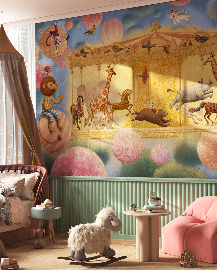 Fototapeta od Wonderwall Studio z nowoczesną grafiką, z wyczuwalną w dotyku strukturą, przedstawia zaczarowany, magiczny świat cyrku, wesołego miasteczka. Na karuzeli razem bawią się kolorowe żyrafy, słoń, hipopotam, niedźwiedź i koniki. Dookoła unoszą się różowe balony, na jednym z nich siedzi lew i puszcza bańki.... Oryginalny mural wspaniale wpisuje się w dziecięcy świat zabaw i wyobraźni, a także w aktualne trendy w aranżacji .