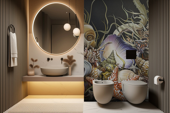Wzór przedstawia bogatą i szczegółową kompozycję morską, skupiającą się na różnorodności skorup i morskich stworzeń. W centrum uwagi znajduje się gwiazda morska o intensywnym pomarańczowym kolorze, która wydaje się być klejnotem tej podwodnej kolekcji. Otaczają ją muszle o różnych kształtach i barwach, od subtelnych pasteli po głębokie błękity, tworząc wrażenie naturalnej symfonii. Delikatne linie i krzywizny roślin wodnych dodają dynamiki, a ich taniec wydaje się być podkreślony przez kontrastujące ciemne tło. To dzieło sztuki jest pełne tekstur, od lśniących perłowych wnętrz muszli po chropowate powierzchnie skorup, co świadczy o artystycznej precyzji i głębokim szacunku dla detali świata natury. Mural jest zarówno hołdem dla piękna oceanu, jak i przypomnieniem o skomplikowanej i delikatnej równowadze ekosystemów morskich.